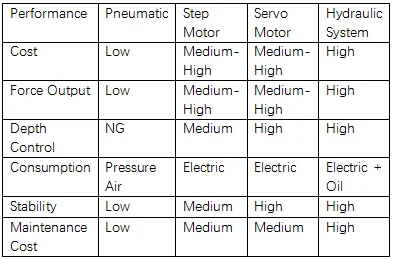 | Performance | Pneumatic | Step Motor | Servo Motor | Hydraulic System |
